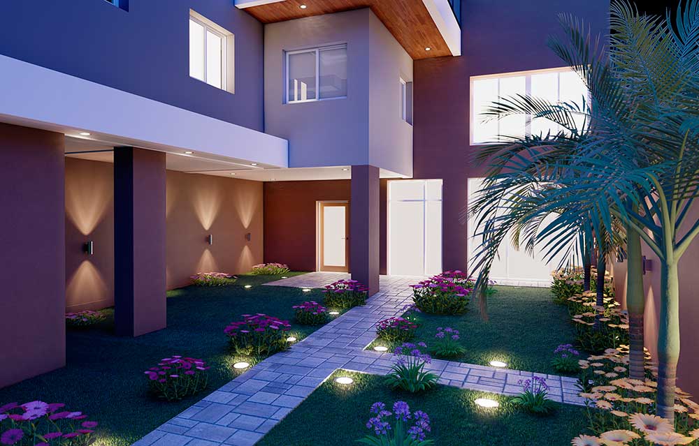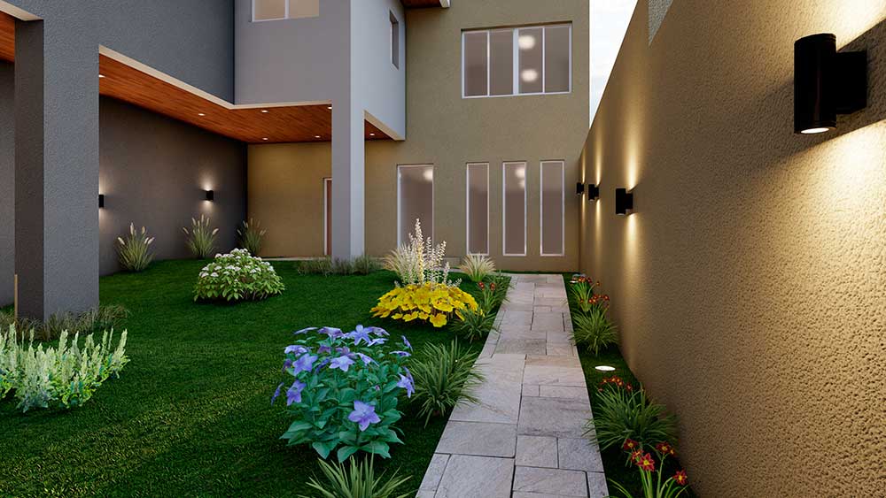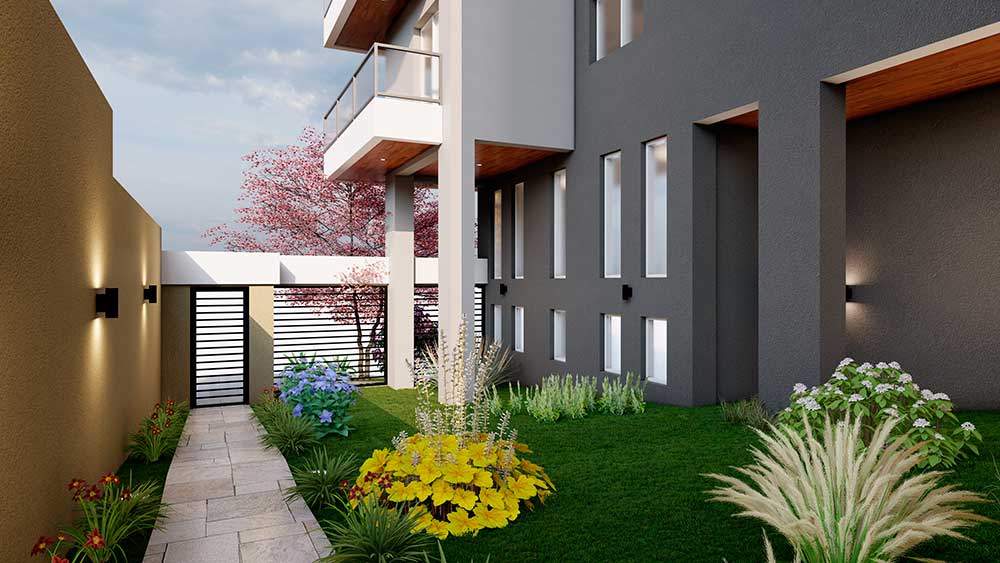 El acceso principal en la planta baja está rodeado de un hermoso jardín de flores y espacios verdes.